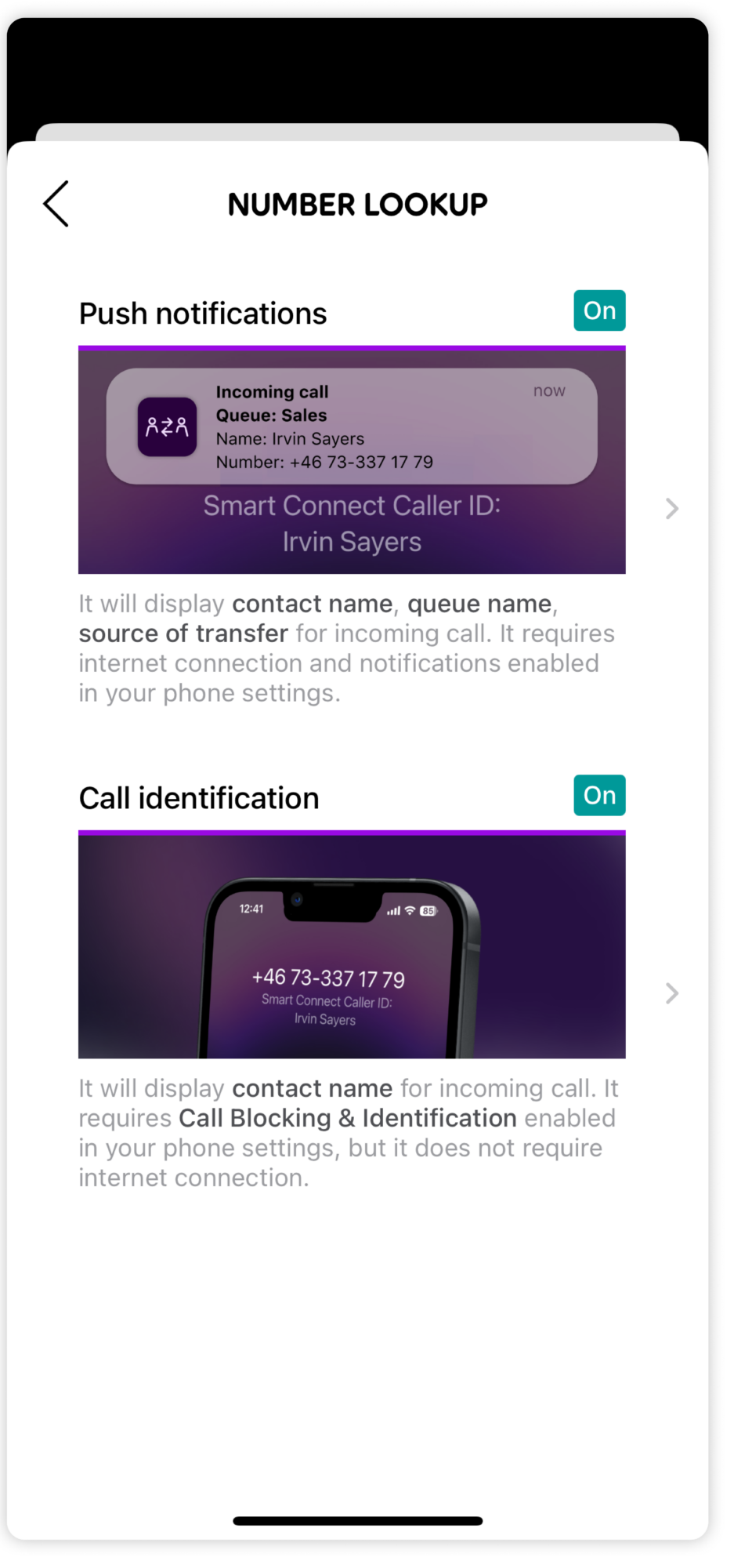 When enabled, the app checks incoming numbers against your company directory. If the number belongs to a colleague or a contact saved in the directory, their name appears on the call screen, in push notifications, and in call logs, without you having to save every number in your local contact book.