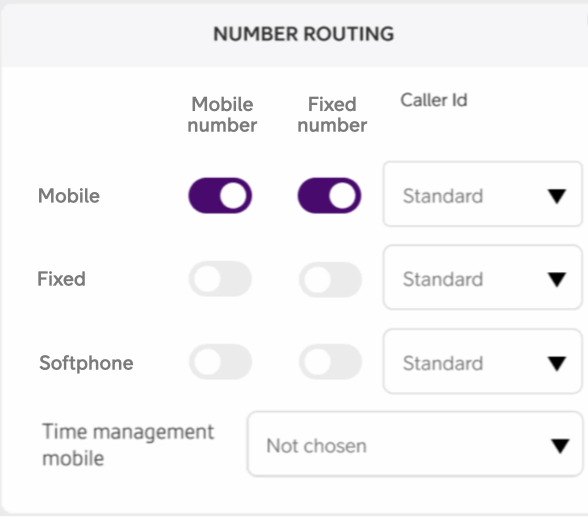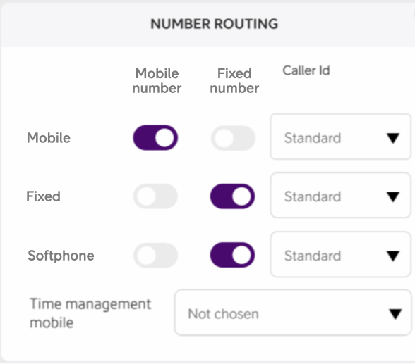Number routing is a setting that controls which devices should ring when a call is received. The routing rules are set per number (e.g. mobile number / fixed number) and they apply to both direct calls and queue calls.