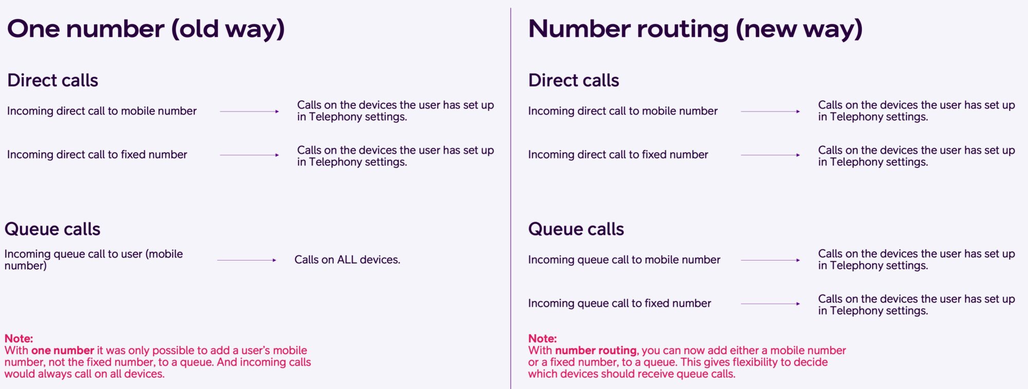 Previously, the setting managing call routing was called One Number. It was only possible to add a mobile number to a queue, and calls would always ring on all devices. With Number Routing, it is now possible to choose what number to add to a queue, mobile or fixed, giving full flexibility over how calls should be handled.