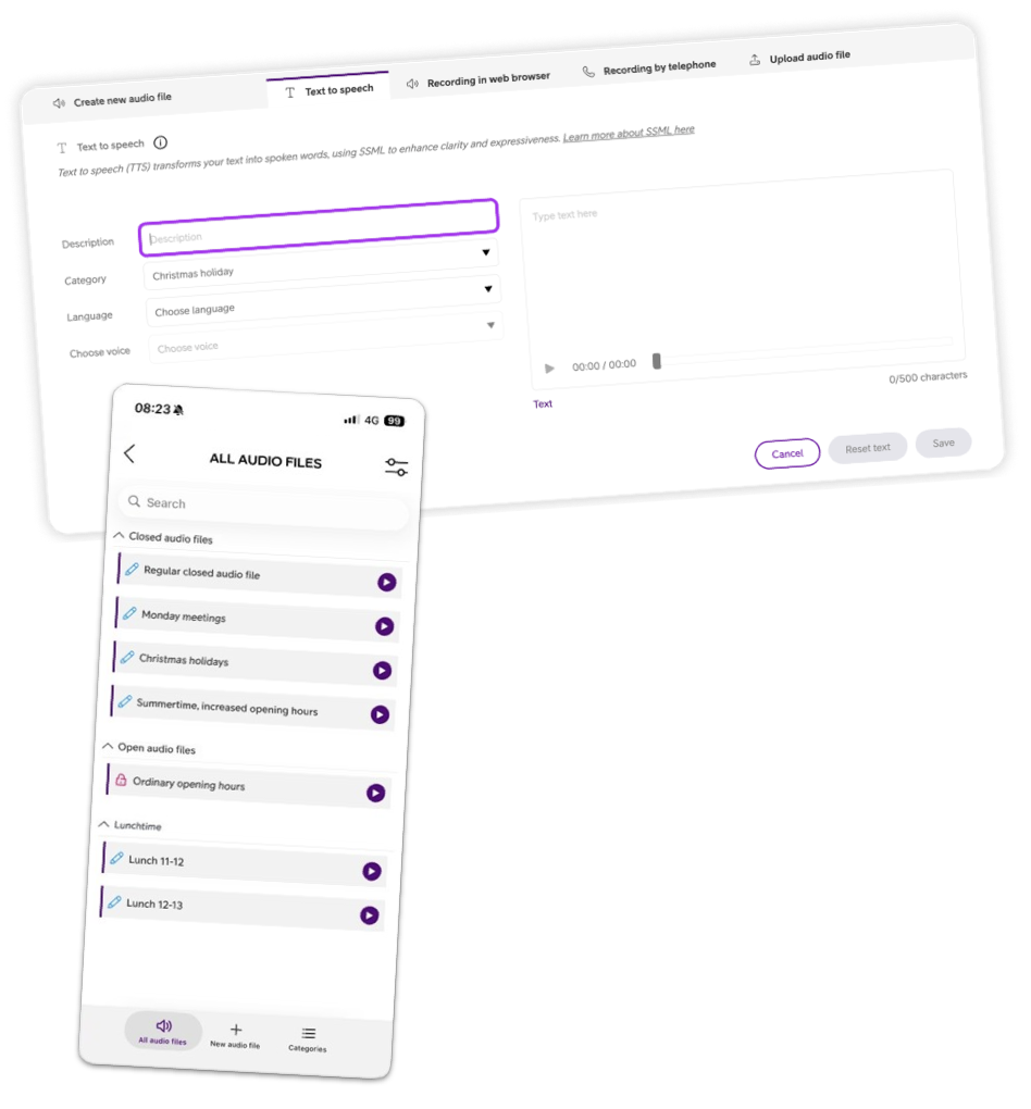 - Create a new audio file using text-to-speech (TTS) by simply writing your message and letting Smart Connect generate the audio for you.