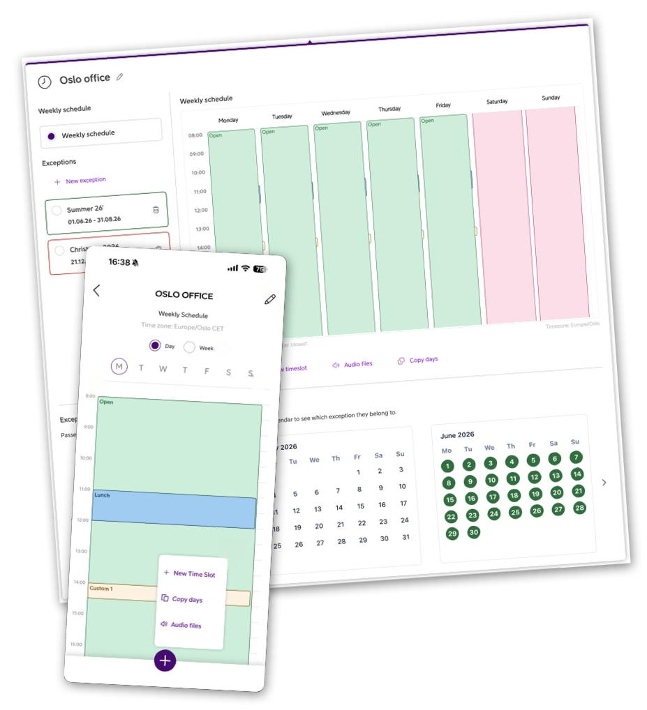 With the Opening Hours module, available in both the desktop interface and the Smart Connect mobile app, you define when and how calls should be handled: