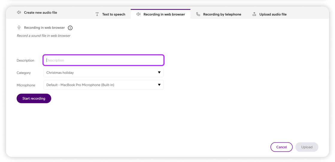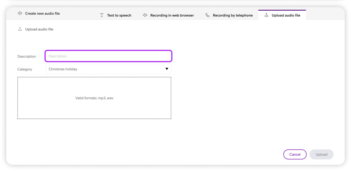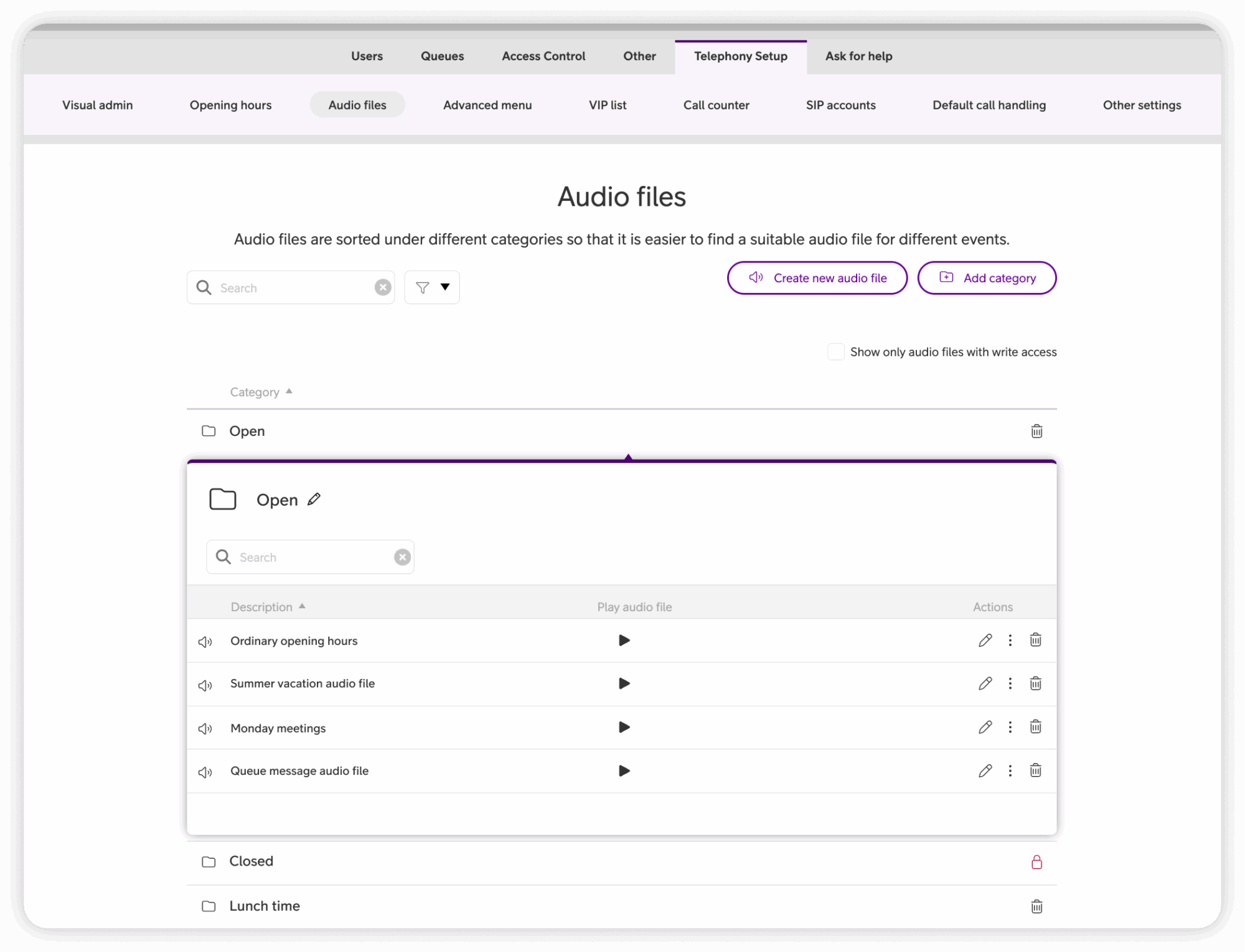 Audio files allow callers to hear important information both during and outside the company’s opening hours. Audio announcements can be used to share opening hours, inform about menu selections, or provide helpful instructions before connecting them to a queue.