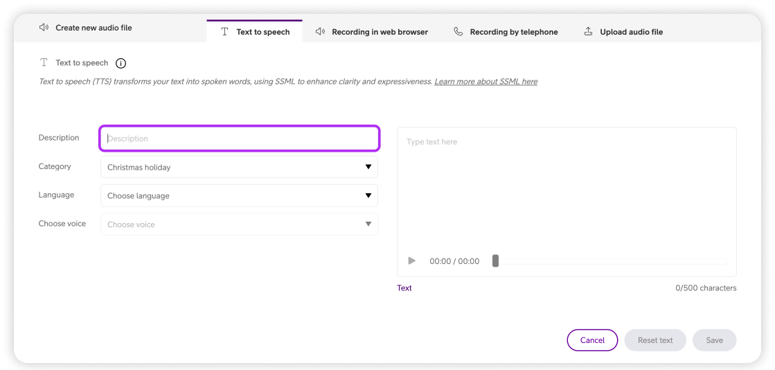 Advanced users can switch from Text to SSML for more controlled speech formatting.