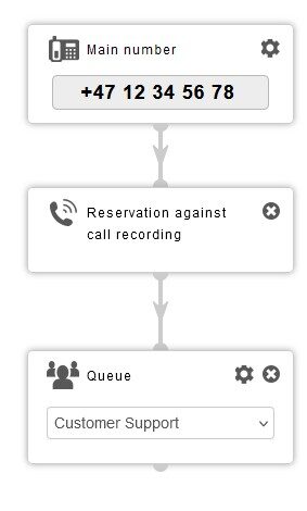 To prevent this, use the Reservation Against Call Recording element in the call flow. This element can be placed anywhere within the flow, ensuring that any calls passing through it will not be recorded, even if the user has Call Recording enabled.
