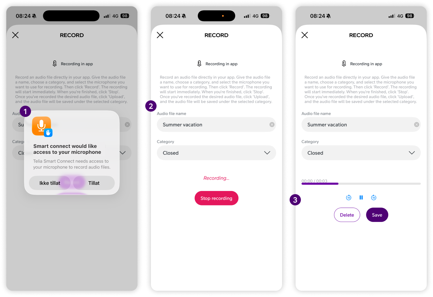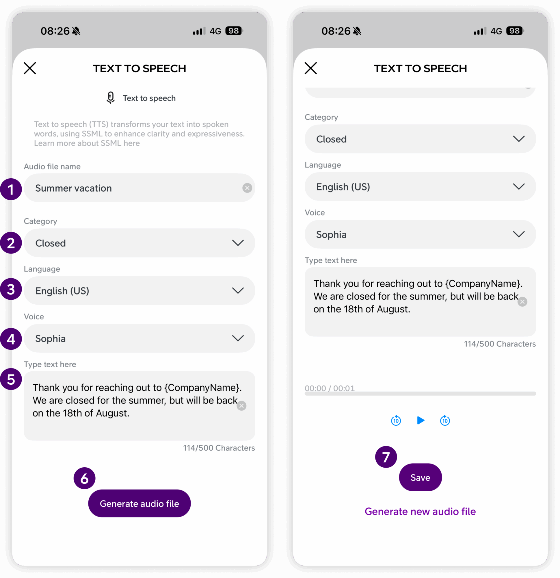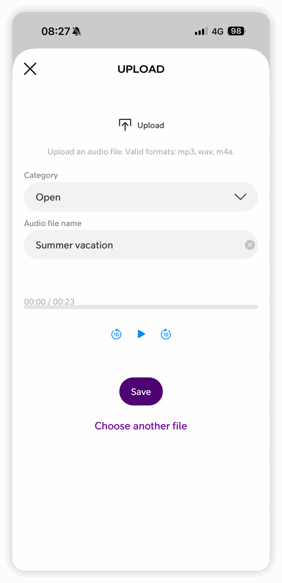 You can create new audio files in three ways: Record, Text to speech, or Upload. All options are found under New audio file in the bottom navigation.