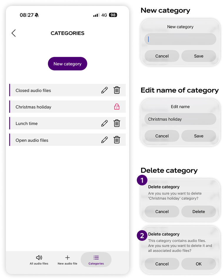 Categories make it easier to structure large audio libraries, for example “Welcome messages,” “Queue announcements,” or “Closed messages.” Administrators can create new categories, rename existing ones, or delete categories when no longer needed.