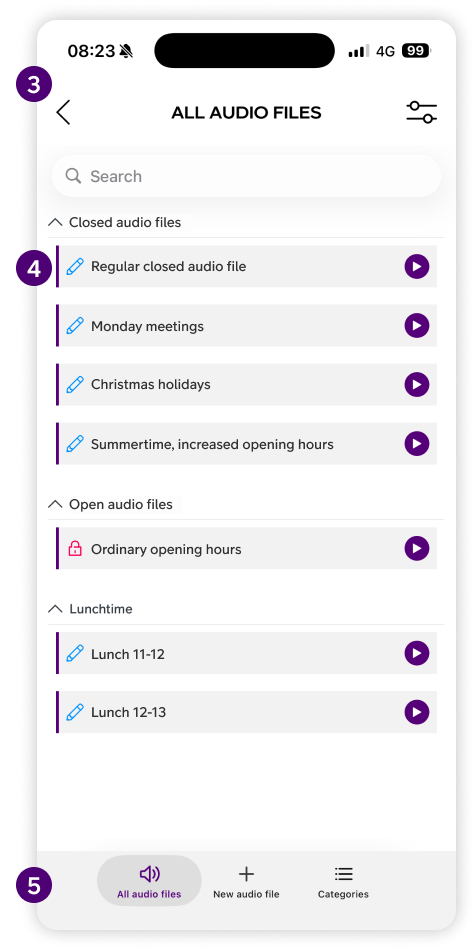 All audio files are listed in the app and grouped by category. You can scroll through the list, filter by category, or use search to quickly find a specific file.