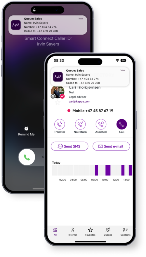 When using Telia Smart Connect app, you are able to activate call identification which lets you see who is calling, even tough it’s an unsaved number, and push notification, which will display who is calling, and which queue they are calling through.*
