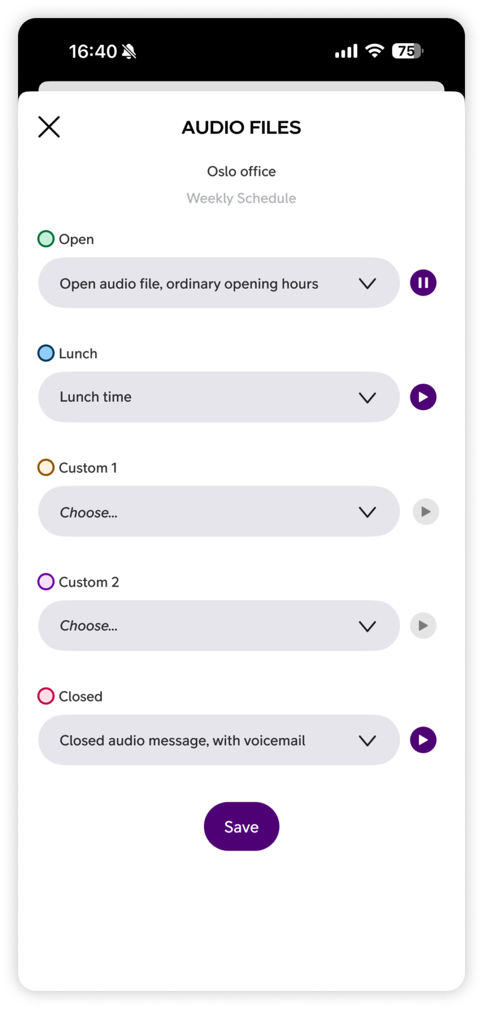 Here you can assign an audio file to each time slot type: Open, Lunch, Custom 1, Custom 2 and Closed. Select the desired audio file for each time slot using the dropdown menu. Tap the Play button to listen to an audio file before selecting it. When you are done, tap Save to activate the selected audio files.
