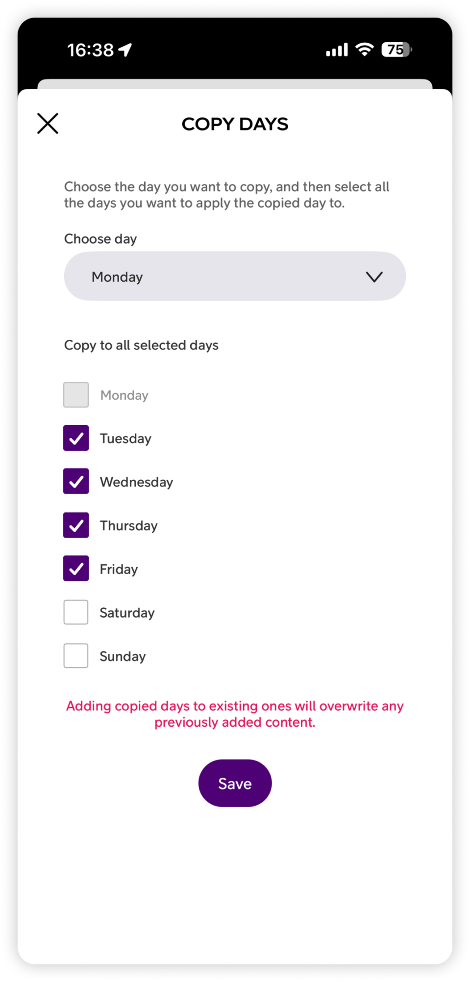- Tap Save. Note that this will overwrite any previously added content on the selected days.