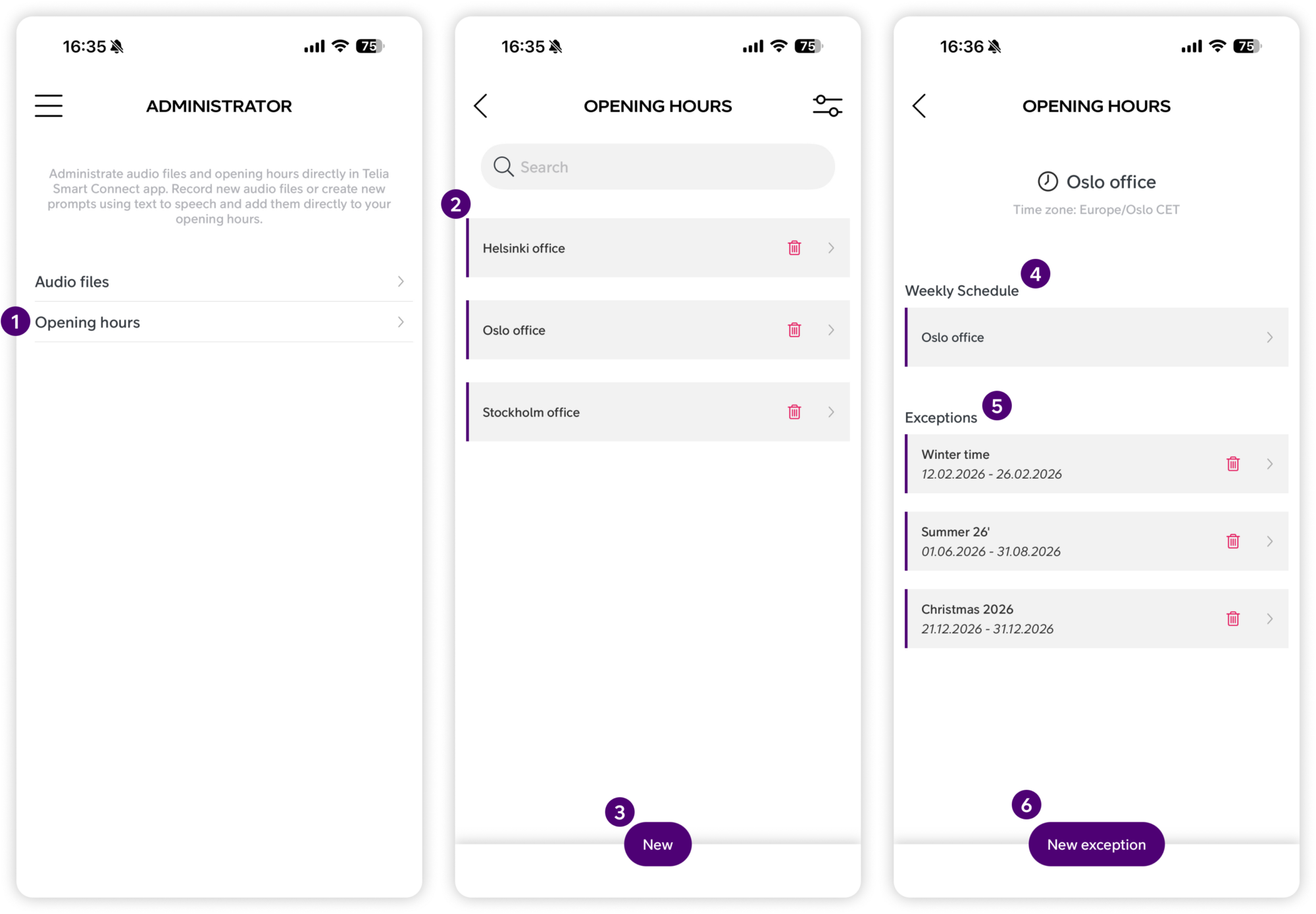 Select the opening hour you want to edit, then tap New exception at the bottom of the screen.