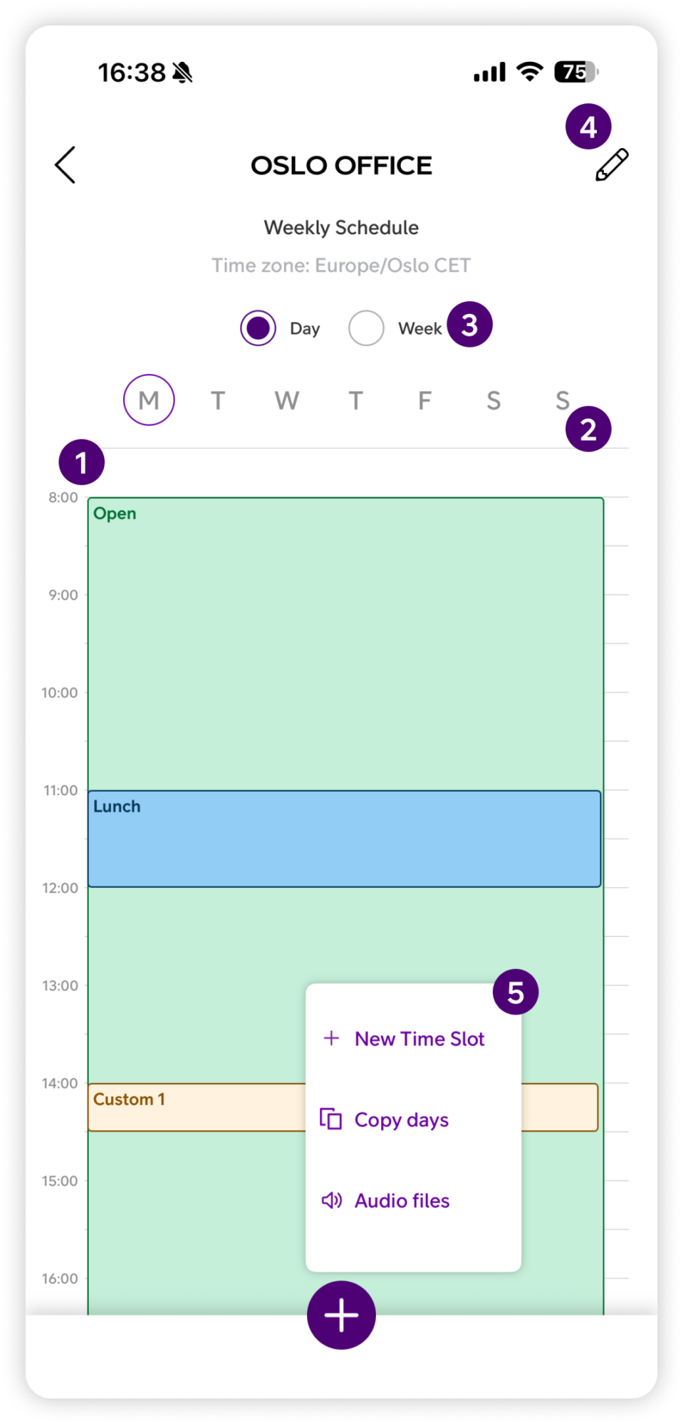 Tap the + button at the bottom of the screen to open the action menu. From here you can tap New time slot to add a new time slot, Copy days to copy the schedule from one day to other days, or Audio files to manage audio files for the opening hour.