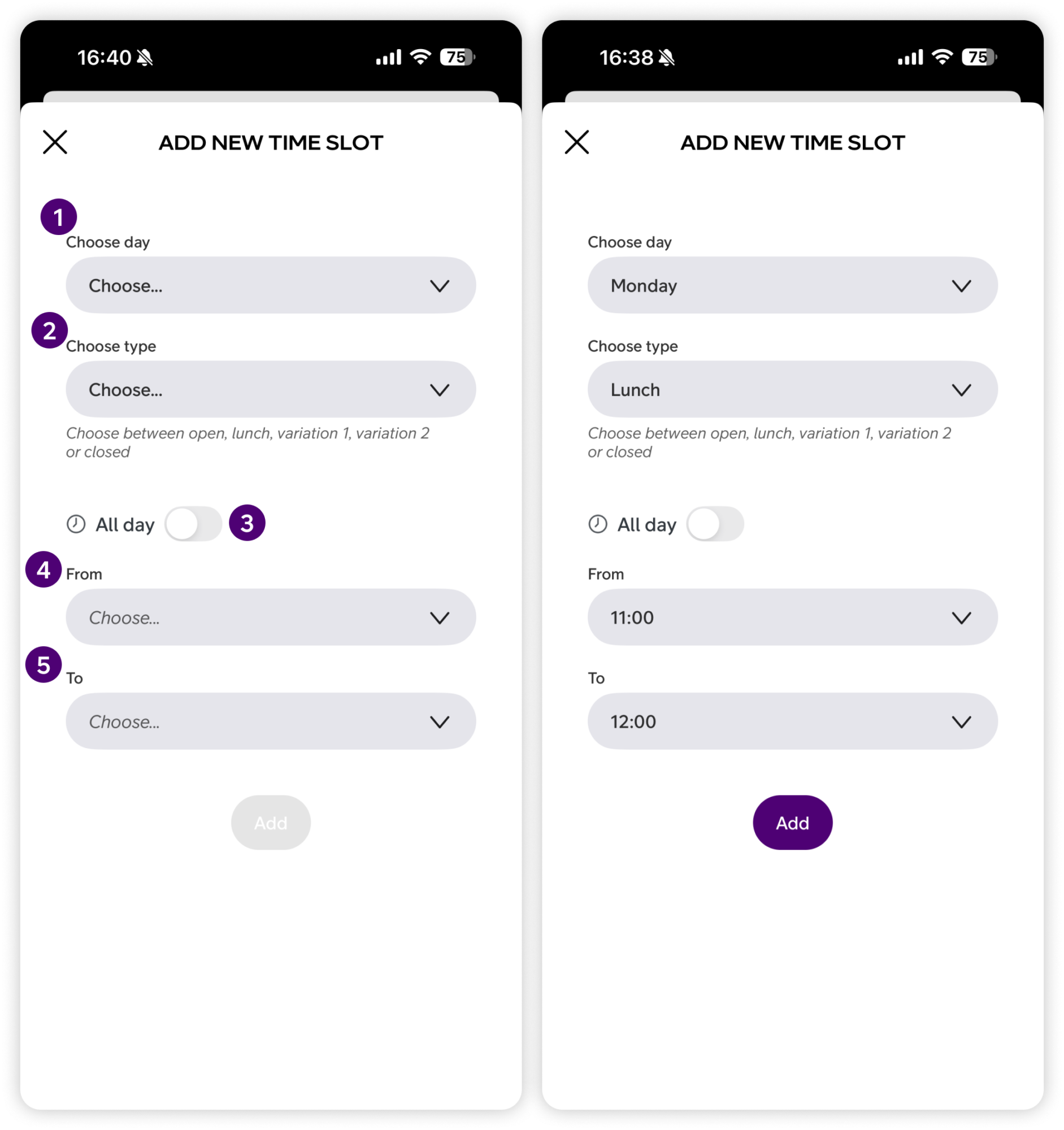 When all fields are filled in, tap Add to save the time slot to the opening hour.