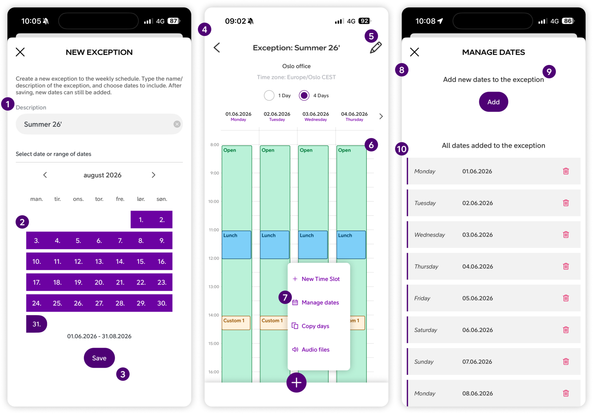 Tap the New exception button at the bottom of the screen. Enter a name for the exception, select the dates it should apply to, and tap Save. Dates can be added or removed after the exception has been created.