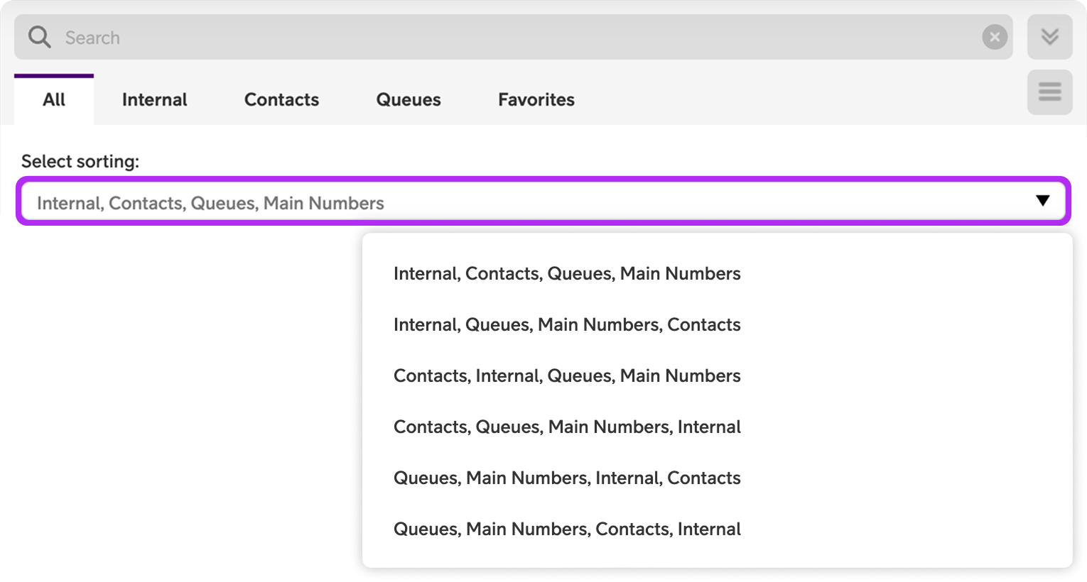 With the help of filters, users can choose whether they want to view internal contacts, queues, and main numbers, or all numbers included in this solution — including internal contacts, external contacts, global contacts, main numbers, etc.