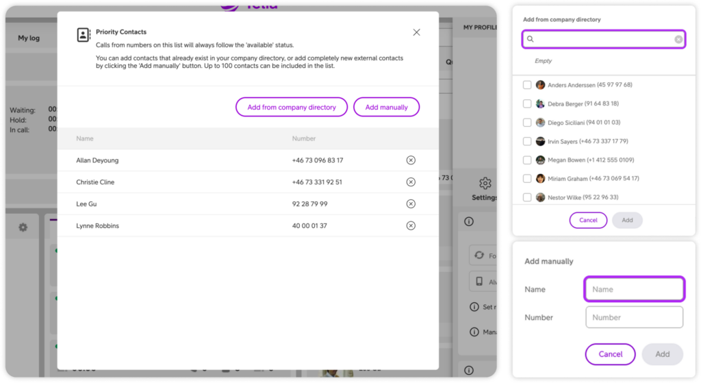 - Search for and add contacts from the company directory, or add a number manually by entering a name and phone number.