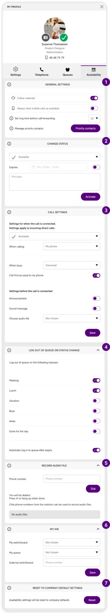 Call settings defines what happens to incoming direct calls for each availability status. You can redirect calls to a queue, a main number, colleague,, and configure separate announcements for calls depending on whether you are free or busy.
